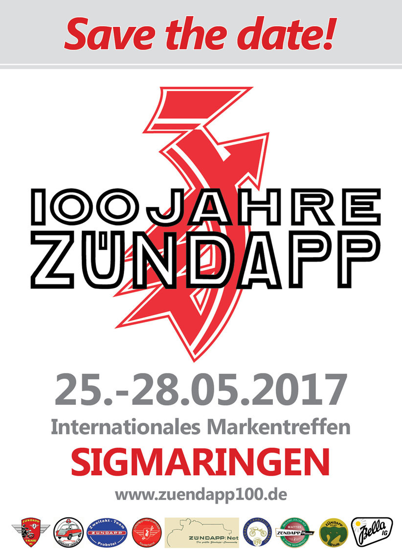 Gemeinsam mit ZÜNDAPP Liebhabern rund um den Globus ein ganzes Wochenende in entspannter Atmosphäre die Leidenschaft teilen und sie auch der Öffentlichkeit zeigen. Mit umfangreichem Programm: Am Donnerstag mit einer kleinen Motorwanderung durch das Sigmaringer Umland und Besichtigung des ZÜNDAPP Museums. Auf dem Veranstaltungsgelände warten – wie auch an den beiden folgenden Tagen – eine Teilebörse und Filmvorführungen historischer ZÜNDAPP Filme auf die Besucher. Am Abend findet im Festzelt die offizielle Begrüßung statt. Der Freitag (26. Mai) ist als Genießertag organisiert, bei dem auf einer Motorwanderung interessante Punkte in der Region angesteuert werden können. Im Schloss Sigmaringen warten besondere Einblicke in die Räumlichkeiten der Fürstenfamilie von Hohenzollern. Der Tag wird mit Benzingesprächen und Party im Festzelt abgerundet Der Samstag (27. Mai) ist als Präsentationstag im Programm verankert, der auf dem Veranstaltungsplatz stattfindet und zu dem auch Gäste und Besucher herzlich eingeladen sind. Eine einzigartige Modellpräsentation durch die Fahrzeuge aller Teilnehmer wird einen einmaligen Überblick über das ZÜNDAPP Produktionsprogramm und die Evolution in den einzelnen Baureihen bieten. Die Vielfalt wird auch durch Specials, Customs auf Zündapp Basis sowie Lizenzbauten und Nachbauten gezeigt. In einem Concours d’Elegance sind alle Teilnehmer und Gäste aufgefordert, die für sie schönsten Fahrzeuge der einzelnen Baureihen zu wählen. Das Beherrschen der Fahrzeuge kann beim Geschicklichkeitsturnier und Slowrace bewiesen werden. Auf einem Rollenprüfstand lässt sich die Motorleistung der Maschinen testen. Krönender Abschluss ist ein geplanter, gemeinsamer Fahrzeugkorso, bevor am Abend im Festzelt die Siegerehrung und Party stattfinden.Am Sonntag (28. Mai) heißt es dann Abschied von den vielen bekannten und neuen Freunden nehmen.